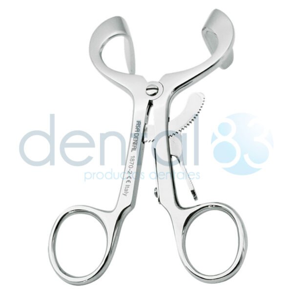 Con una longitud de 11 cm, es ideal para el manejo en bocas pequeñas, proporcionando un control preciso. Su diseño consiste en dos ramas articuladas con superficies curvas y estriadas que se colocan entre los dientes para mantener la boca abierta. El tamaño reducido y diseño ergonómico están adaptados para la anatomía de los pacientes pediátricos, ofreciendo estabilidad y comodidad tanto para el niño como para el profesional.