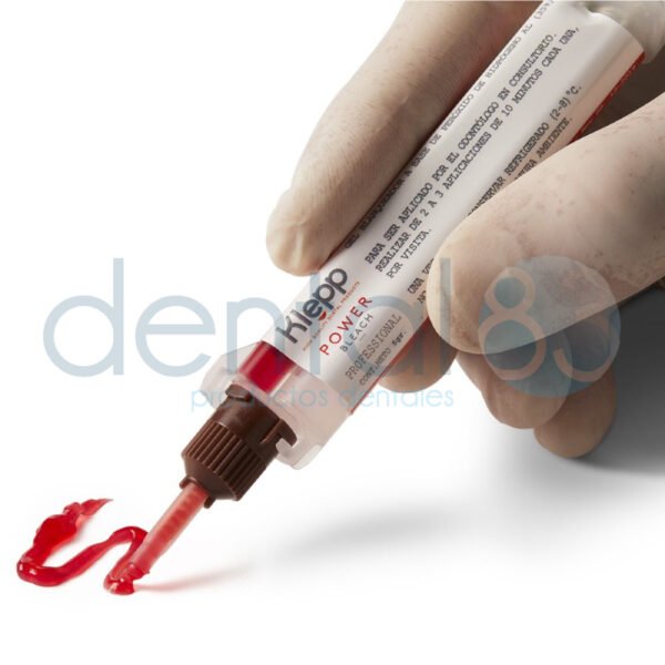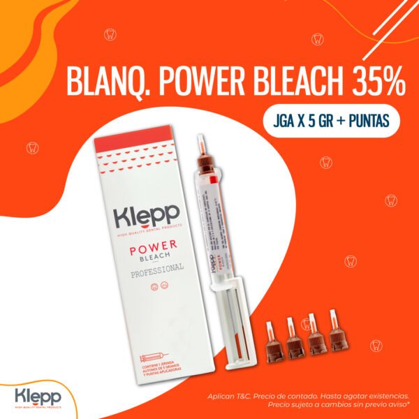 Klepp Power Bleach Profesional: con Peróxido de Hidrógeno al 35% Contiene un gel blanqueador y un activador con una jeringa doble (cartucho) de auto mezcla 4:1, este sistema permite administrar la dosis precisa del activador en cada aplicación. El contenido de peróxido de hidrógeno en el gel preparado asciende al 35%.