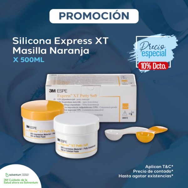 La SILICONA EXPRESS XT MASILLA NARANJA 3M X 500 ML está diseñada para crear impresiones de precisión en la primera toma para manejar con confianza una amplia gama de casos, incluyendo impresiones para prótesis dentales, coronas e implantes. Está disponible en una gama de viscosidades y 2 tiempos de fraguado.